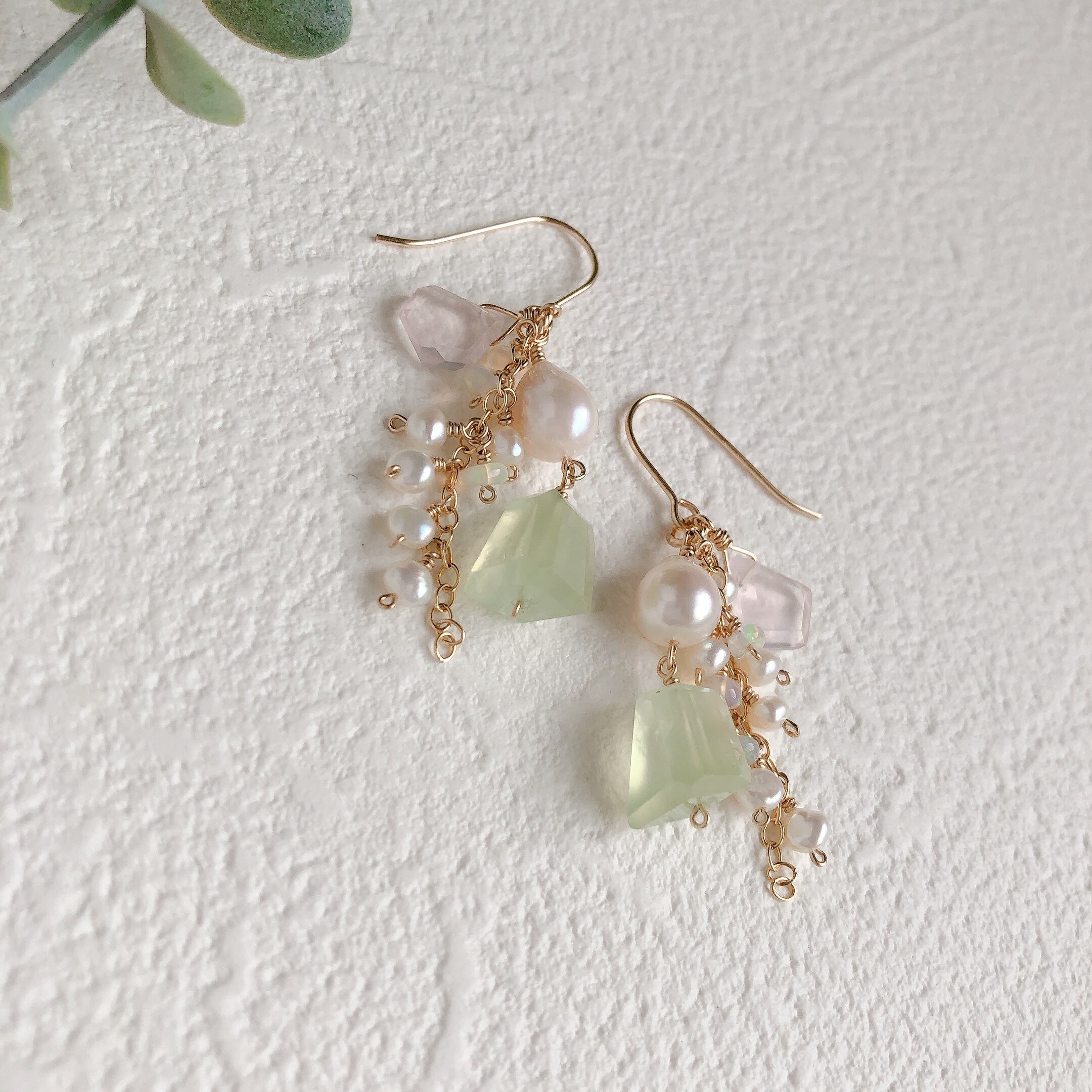 マスカットの様なカワイイお色のプレナイトとツヤツヤあこや真珠を使用したシャラシャラピアス